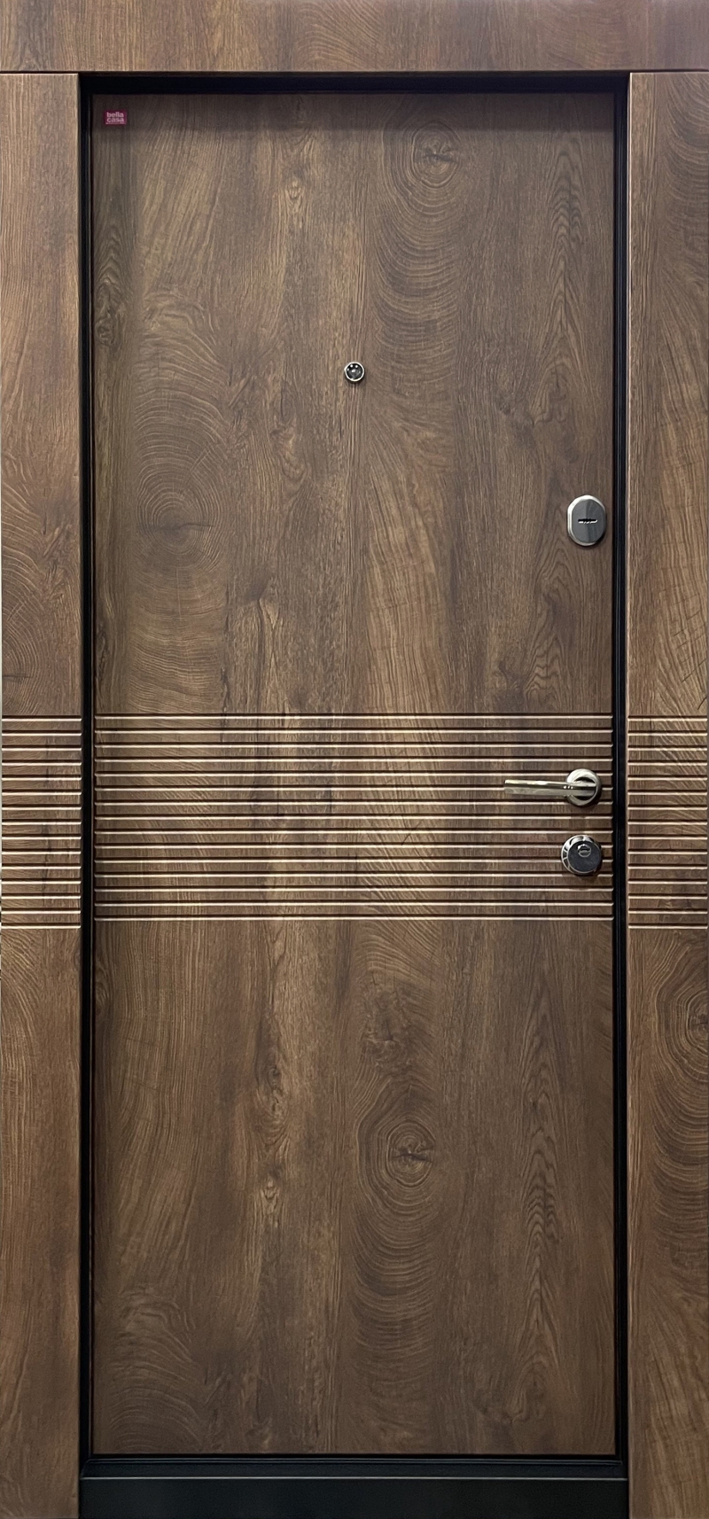 Ușa metalică placată cu MDF are o greutate de 70 kg și are 3 balamale reglabile. Garniturile de etanșare împotriva curenților de aer sunt tubulare din cauciuc. Ușa dispune de garnitură de etanșare pe foaie de ușă și pe toc.
